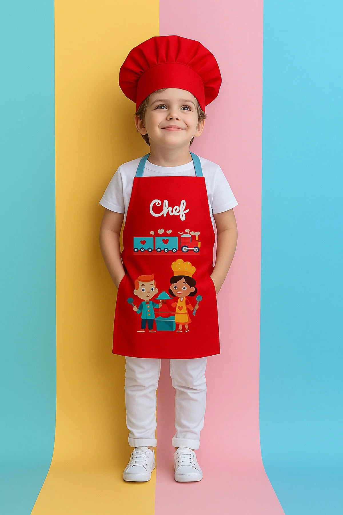 AYSHome Kırmızı Trenli Çocuk Mutfak Önlüğü Seti