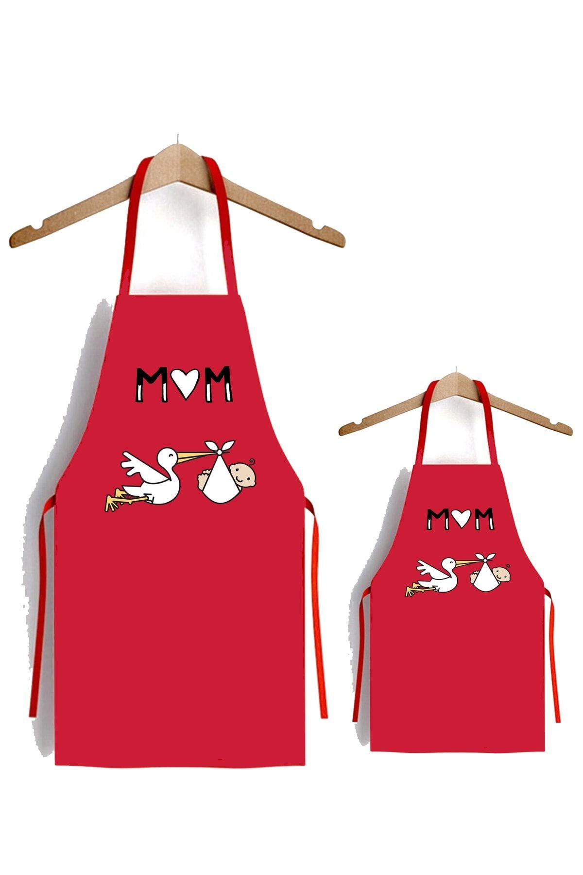 AYSHome Kırmızı Leylek Anne Çocuk 2'li Mutfak Önlüğü Seti